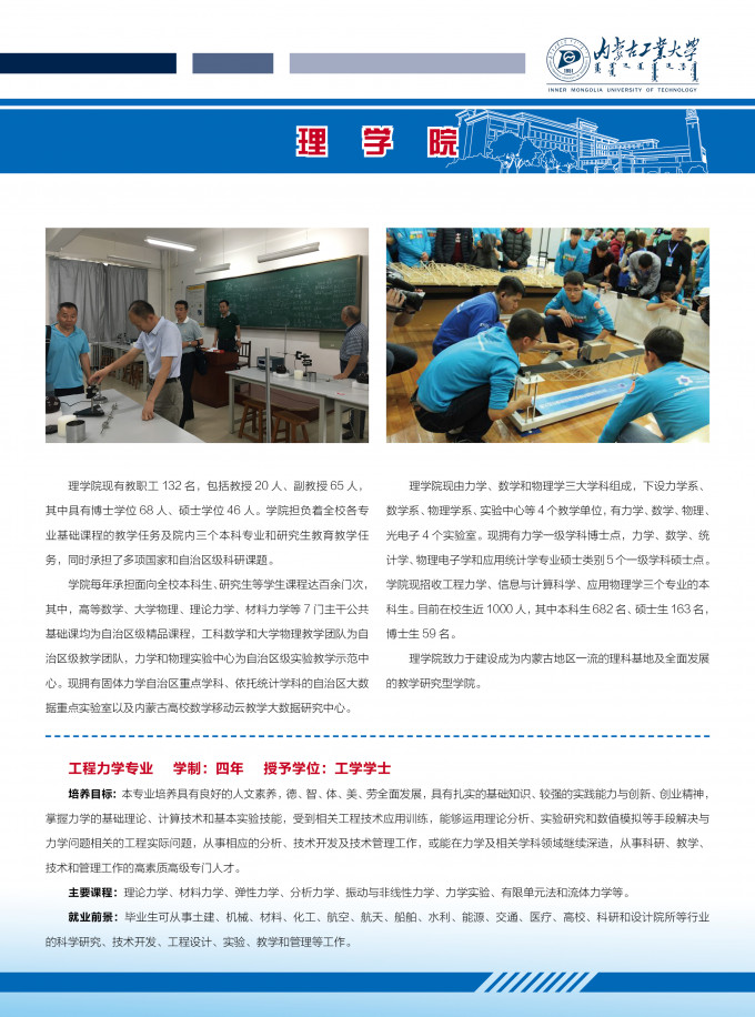 培养目标:本专业培养具有良好的人文素养,德、智、体、美、劳全面发展,具有扎实的基础知识、较强的实践能力与创新、创业精神,掌握力学的基础理论、计算技术和基本实验技能,受到相关工程技术应用训练,能够运用理论分析、实验研究和数值模拟等手段解决与力学问题相关的工程实际问题,从事相应的分析、技术开发及技术管理工作,或能在力学及相关学科领域继续深造,从事科研、教学、技术和管理工作的高素质高级专门人才。